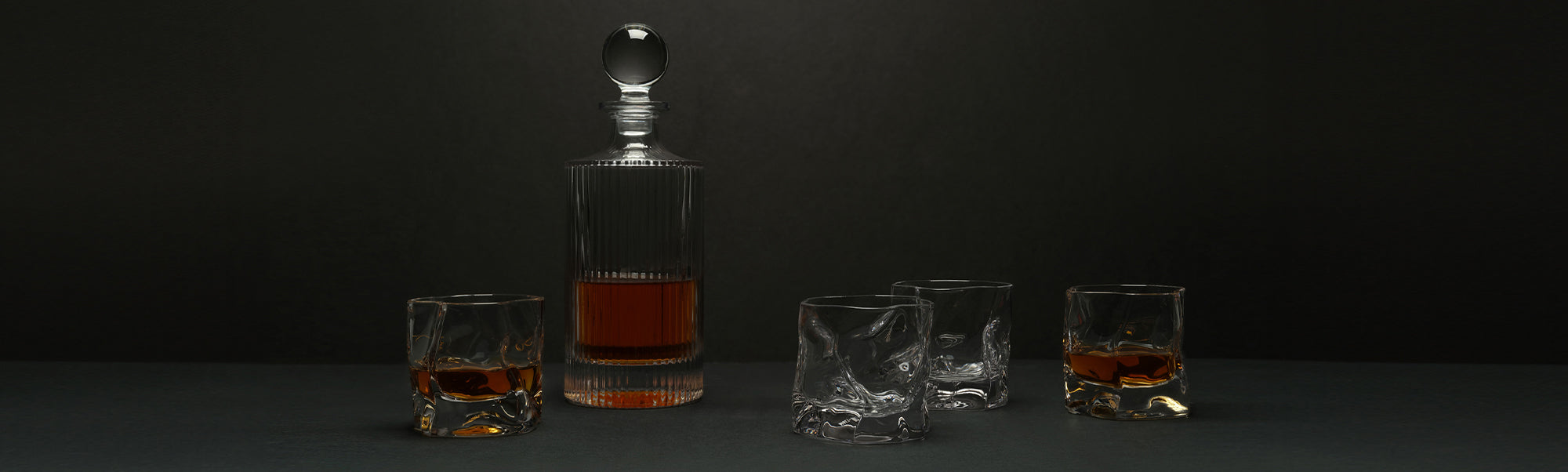 The decanter is paired with four of our bestselling Wave Glasses, designed with a flowing form that naturally swirls and opens up your whisky — whether neat or on the rocks.